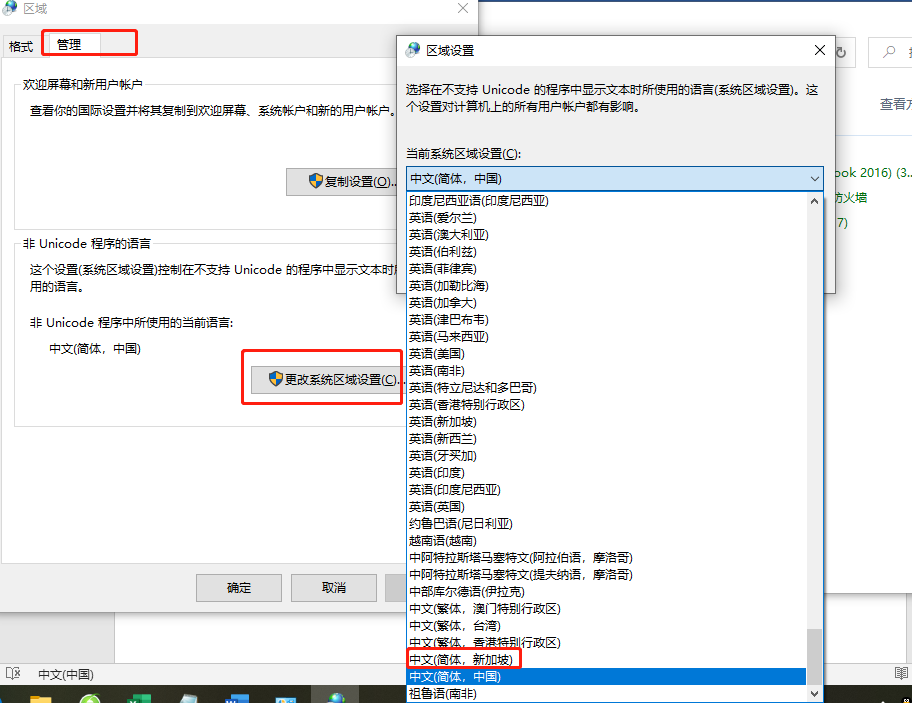 打开控制面板-区域与语言(WIN7及XP显示为区域与语言,WIN10中显示为区域)--管理—更改系统区域设置,在弹窗中将当前系统区域设置更改为中文(简体,新加坡),更改后提示重启电脑,待电脑启动起来后再同样操作,将当前系统区域设置重新改回中文(简体,中国),然后再重新查看客户端升级包以及开始菜单中客户端文件夹名称,已经不再是乱码。(下图为WIN10示例)
