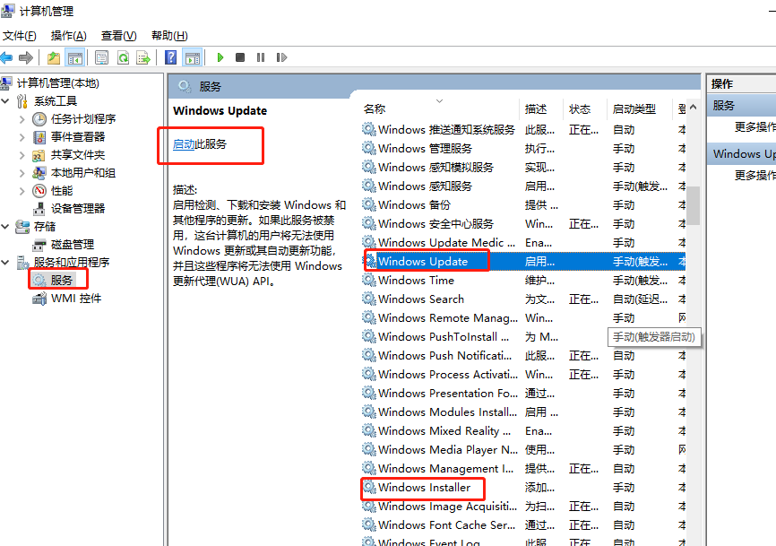 2 若点击确定后,系统更新.Net Framework3.5时报错,右键此电脑-管理-服务,在右侧找到Windows Installer及Windows Update服务,启动这两项服务,然后重复方法1中的操作。