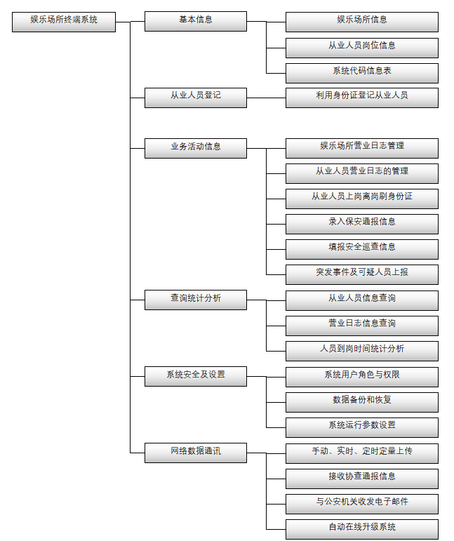 娱乐场所终端系统安装在各个娱乐场所,主要用于娱乐场所日常登记从业人员信息、记录营业日志、上传保安通报信息及安全巡查信息等